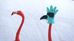 Zwei Flamingos entdecken einen bunten Handschuh auf der Skipiste. Aber wofür ist das seltsame Ding gut?
