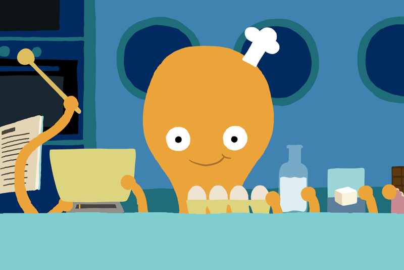 Die Krake möchte in ihrer Unterwasserküche einen schönen Pfirsichkuchen backen. Aber einer ihrer Arme hat andere Pläne.