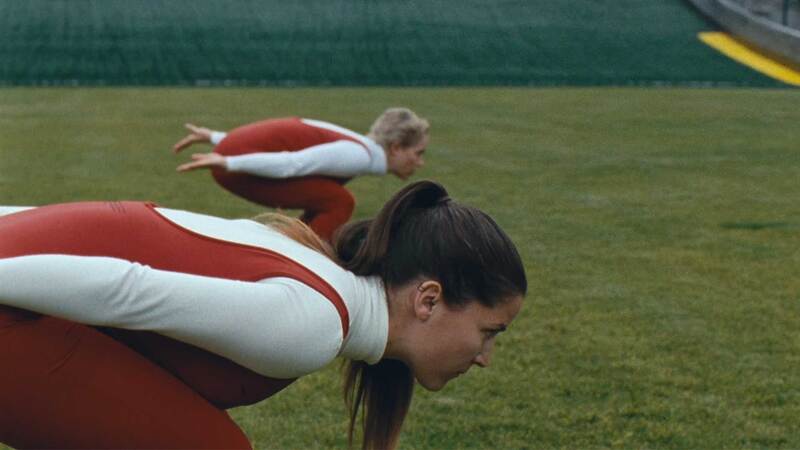 Eine große Skisprungschanze blitzt metallisch im spätsommerlichen Licht der Alpen. Zwei Skispringerinnen proben synchron Bewegungsabläufe im Tal, beantworten generische Fragen vor einem Greenscreen und posieren auf der Schanze, während ein Filmteam sie dabei beobachtet. Für die beiden Sportlerinnen ist es das erste Wiedersehen nach ihrer Trennung.
